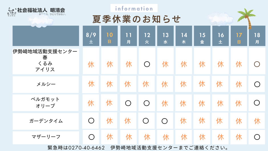 通知 · 2025/07/25 【お知らせ】夏季休業について(再掲載) 平素より、当法人の運営にご理解ご協力を賜り、誠にありがとうございます。 下記の通り、夏季休業をさせていただきます。 酷暑が続いておりますので、休み中も熱中症対策をはじめ、体調管理にご留意ください。 なお、緊急時は0270-40-6462 伊勢崎地域活動支援センターまでご連絡ください。 tagPlaceholderカテゴリ: